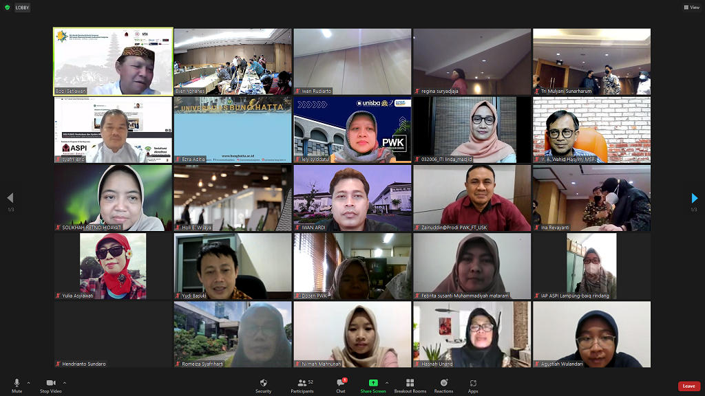 Adapun Workshop Konsolidasi Program Kerja ASPI dilakukan dalam 3 (tiga) sesi parallel, yaitu sesi Paralel 1 – Koordinasi Percepatan Pembentukan Forum Penataan Ruang Daerah, dengan narasumber Ketua ASPI 2021-2023 Prof. Dr. Iwan Rudiarto, Ketua Umum Ikatan Ahli Perencanaan Indonesia: Dr. Hendricus Andy Simarmata, Korwil ASPI Sumatera 1: Prof. Dr. Ashfa, S.T., M.T, dan Korwil ASPI Sumatera 2: Ezra Aditia, ST, MSc. Sesi Paralel – 2 Program Magang MBKM menampilkan narasumber dari Kementerian ATR/BPN yaitu Putri Nurul Probowati, ST., M.Ars. Adapun sesi Paralel – 3 adalah mengenai Sosialisasi Akreditasi Program Studi dengan narasumber Ketua Majelis BAN-PT : Prof. Dr. rer.nat. Imam Buchori, ST. dan Asesor BAN-PT : Dr. Ir. Heru Purboyo P. DEA.