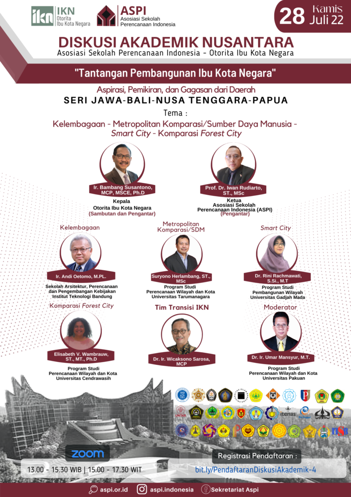 Pada Kamis, 28 Juli 2022 telah diselenggarakan Diskusi Akademik – Series Sulawesi yang bertemakan “Kelembagaan-Metropolitan Komparasi Sumber Daya Manusia-Smart City-Komparasi Forest City”, dilaksanakan secara daring menggunakan Zoom Meeting pukul 13.00-16.00. Acara ini dihadiri oleh kurang lebih 200 peserta.