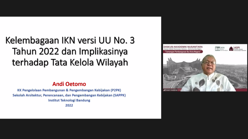 Pada sesi kelembagaan, Ir. Andi Oetomo, M.PL – Institut Teknologi Bandung menyampaikan di masa mendatang ketika sudah operasional dengan sejumlah penduduk IKN yang berdomisili di wilayah IKN, maka sistem tata kelola yang lebih menjamin pemenuhan urusan wajib yang terkait dan tidak terkait kebutuhan dasar harus dipastikan dapat dilaksanakan dengan baik, di samping penciptaan urusan pilihan ekonomi wilayah yang lebih disesuaikan dengan basis ekonomi wilayah dan kota yang ada.