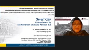 Sesi selanjutnya yang diisi oleh Dr. Rini Rachmawati, S.Si., MT, terkait Smart city dalam mempersiapkan IKN harus mempertimbangkan: smart governance, living, environment, economy, society, dan branding. Elemen smart governance paling penting untuk IKN. Smart living, environment, dan branding juga perlu dipertimbangkan di awal.